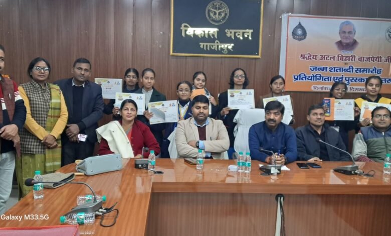 गाजीपुर। मुख्य सचिव उत्तर प्रदेश शासन के निर्देश पर जनपद मुख्यालय स्थित विकास भवन सभागार में भारत रत्न श्रद्धेय अटल बिहारी वाजपेई की जन्मशताब्दी समारोह का आयोजन किया गया। कार्यक्रम का शुभारंभ मुख्य अतिथि सपना सिंह, अध्यक्ष जिला पंचायत गाजीपुर, मुख्य विकास अधिकारी संतोष कुमार वैश्य, प्राचार्य प्रो. अनीता कुमारी एवं जिला विद्यालय निरीक्षक प्रकाश सिंह द्वारा वाजपेई जी की प्रतिमा पर माल्यार्पण एवं दीप प्रज्वलन कर किया गया।इस अवसर पर विद्यार्थियों एवं अभिभावकों ने लखनऊ में उद्घाटित प्रेरणा स्थल के अवसर पर प्रधानमंत्री एवं मुख्यमंत्री के संबोधन का श्रवण किया। कार्यक्रम के दौरान जनपद स्तरीय काव्य पाठ, भाषण एवं निबंध प्रतियोगिता के विजेता विद्यार्थियों को प्रमाण पत्र एवं पुरस्कार राशि के चेक प्रदान किए गए।काव्य पाठ प्रतियोगिता में विजयलक्ष्मी प्रजापति, अंकिता सेन एवं रिंकी शुक्ल क्रमशः प्रथम, द्वितीय एवं तृतीय रहीं। भाषण प्रतियोगिता में प्रज्ञा वर्मा, अमृता राय एवं श्रेया मौर्य तथा निबंध प्रतियोगिता में प्राची कश्यप, दिव्या कुशवाहा एवं स्नेहा पांडे ने क्रमशः प्रथम, द्वितीय एवं तृतीय स्थान प्राप्त किया।विजेता छात्राओं ने अपने काव्य एवं विचार प्रस्तुत कर उपस्थित जनसमूह की सराहना प्राप्त की। मुख्य अतिथि सपना सिंह ने छात्राओं के उत्कृष्ट प्रदर्शन की प्रशंसा करते हुए उन्हें देश का भविष्य बताया। जिला विद्यालय निरीक्षक प्रकाश सिंह ने अटल जी के व्यक्तित्व को विचारों में दृढ़ता और व्यवहार में विनम्रता का प्रतीक बताया, जबकि प्राचार्य प्रो. अनीता कुमारी ने उनके सुशासन को आधुनिक भारत के विकास की आधारशिला कहा।कार्यक्रम का संयोजन डॉ. शिव कुमार, संचालन डॉ. संगीता मौर्य तथा आभार ज्ञापन जिला समाज कल्याण अधिकारी राम नगीना यादव ने किया। कार्यक्रम में जिला स्तरीय अधिकारी, शिक्षक, अभिभावक एवं छात्राएं उपस्थित रहीं।
