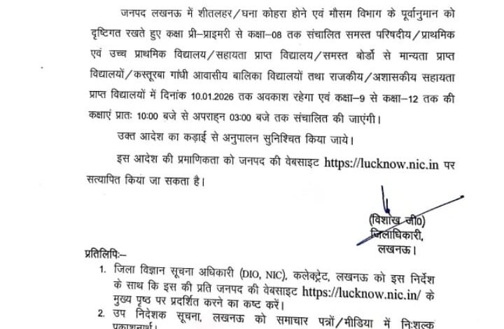 लखनऊ में मौसम विभाग के पूर्वानुमान के मद्देनजर कड़ाके की ठंड और घने कोहरे के कारण कक्षा प्री-प्राइमरी से कक्षा 8 तक संचालित सभी परिषदीय, प्राथमिक, उच्च प्राथमिक, सहायता प्राप्त, बोर्ड से मान्यता प्राप्त विद्यालय, कस्तूरबा गांधी आवासीय बालिका विद्यालय तथा अन्य सरकारी/अशासकीय सहायता प्राप्त स्कूलों में 10 जनवरी तक अवकाश रहेगा। इसके साथ ही कक्षा 9 से 12 तक की कक्षाएं प्रातः 10:00 बजे से अपराह्न 3:00 बजे तक संचालित की जाएंगी। जिलाधिकारी विशाख जी ने इस आदेश का कड़ाई से अनुपालन सुनिश्चित करने के निर्देश दिए हैं।