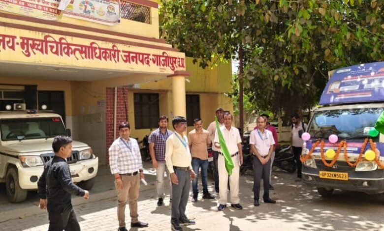 गाजीपुर : एसीएमओ ने हरी झंडी दिखाकर आयुष्मान भारत और कैशलेस चिकित्सा योजना के प्रचार-प्रसार हेतु जागरूकता रथ को किया रवाना