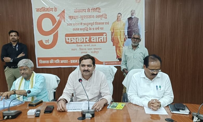 गाजीपुर, 18 मार्च 2026: भारत सरकार के 11 वर्ष एवं उत्तर प्रदेश सरकार के 9 वर्ष पूर्ण होने के अवसर पर गाजीपुर के विकास भवन सभागार में सदस्य विधान परिषद विशाल सिंह “चंचल” द्वारा प्रेस वार्ता आयोजित की गई। इस दौरान उन्होंने प्रदेश सरकार की उपलब्धियों को विस्तार से बताते हुए बदलते उत्तर प्रदेश की तस्वीर प्रस्तुत की।प्रेस वार्ता में उन्होंने जनपद में हो रहे प्रमुख विकास कार्यों का उल्लेख करते हुए बताया कि 208.85 करोड़ रुपये की लागत से मेडिकल कॉलेज की स्थापना का कार्य कराया गया है तथा 9.99 करोड़ रुपये की लागत से नर्सिंग कॉलेज का निर्माण प्रगति पर है। वाराणसी-गोरखपुर हाईवे के चौड़ीकरण और पुनर्निर्माण के साथ ही ग्रीन फील्ड एक्सप्रेस-वे का निर्माण कार्य जारी है, जिससे एनएच-29 और एनएच-19 का सीधा संपर्क स्थापित होगा। इसके अतिरिक्त पूर्वांचल एक्सप्रेस-वे के अंतर्गत 35 किमी सड़क का निर्माण कराया गया है।उन्होंने बताया कि जनपद में शिक्षा, स्वास्थ्य और बुनियादी ढांचे के क्षेत्र में व्यापक कार्य हुए हैं, जिनमें गहमर में राजकीय महाविद्यालय का निर्माण तथा गाजीपुर शहर में सीवरेज और सीवेज ट्रीटमेंट प्लांट की स्थापना शामिल है।कृषि एवं किसान कल्याण योजनाओं का उल्लेख करते हुए उन्होंने बताया कि प्रधानमंत्री किसान सम्मान निधि के अंतर्गत 4.65 लाख से अधिक किसानों को लगभग 1797 करोड़ रुपये की धनराशि दी गई है। पीएम कुसुम योजना, बागवानी विकास मिशन और सिंचाई योजनाओं के माध्यम से भी किसानों को लाभान्वित किया गया है।सामाजिक कल्याण योजनाओं के तहत वृद्धा पेंशन, दिव्यांग पेंशन, निराश्रित महिला पेंशन तथा आयुष्मान कार्ड जैसी योजनाओं से लाखों लोगों को लाभ मिला है। साथ ही मुख्यमंत्री कन्या सुमंगला योजना, जननी सुरक्षा योजना और शादी अनुदान योजना के तहत भी बड़ी संख्या में लाभार्थियों को सहायता प्रदान की गई है।उन्होंने बताया कि आवास योजनाओं के तहत प्रधानमंत्री आवास (ग्रामीण एवं शहरी) और मुख्यमंत्री आवास योजना के माध्यम से हजारों आवास पूर्ण कर लाभार्थियों को दिए गए हैं। उज्ज्वला योजना के अंतर्गत 3.21 लाख परिवारों को मुफ्त गैस कनेक्शन उपलब्ध कराए गए हैं।रोजगार एवं स्वरोजगार के क्षेत्र में भी उल्लेखनीय प्रगति हुई है। मुख्यमंत्री स्वरोजगार योजना और युवा उद्यमी विकास योजना के तहत हजारों लाभार्थियों को वित्तीय सहायता दी गई है। राष्ट्रीय ग्रामीण आजीविका मिशन के अंतर्गत स्वयं सहायता समूहों को बैंक क्रेडिट लिंकेज उपलब्ध कराया गया है।प्रेस वार्ता में जिलाध्यक्ष भाजपा ओमप्रकाश राय, ब्लॉक प्रमुख बिरनो राजन सिंह, मुख्य विकास अधिकारी संतोष कुमार वैश्य, जिला सूचना अधिकारी राकेश कुमार सहित अन्य अधिकारी एवं मीडिया प्रतिन