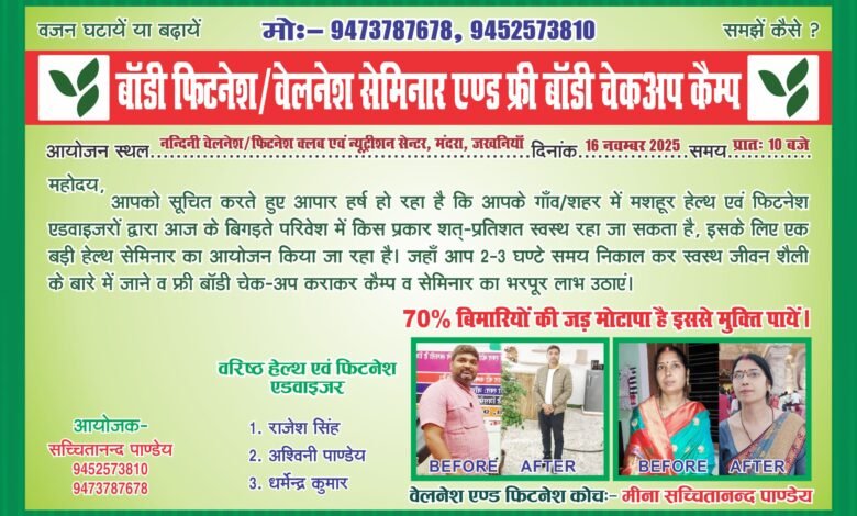 जखनिया/गाजीपुर।नन्दिनी वेलनेश/फिटनेश क्लब एवं न्यूट्रीशन सेंटर, मंदरा, जखनिया में बॉडी फिटनेस/वेलनेस सेमिनार एवं फ्री बॉडी चेकअप कैम्प का आयोजन 16 नवम्बर 2025 को प्रातः 10 बजे किया जाएगा। इसमें मशहूर हेल्थ एवं फिटनेस एडवाइजर आम लोगों को स्वस्थ जीवन शैली अपनाने के तरीकों से अवगत कराएंगे।आयोजकों ने बताया कि आज के बिगड़ते परिवेश में स्वस्थ रहना सबसे बड़ी चुनौती बन गया है। ऐसे में यह सेमिनार स्वास्थ्य के प्रति जागरूकता बढ़ाने में महत्वपूर्ण भूमिका निभाएगा। प्रतिभागियों को 2–3 घंटे के इस कार्यक्रम में फ्री बॉडी चेकअप के साथ स्वास्थ्य से जुड़ी सभी जरूरी जानकारियाँ उपलब्ध कराई जाएंगी।