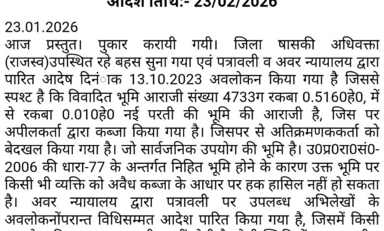 प्राप्त जानकारी के अनुसार यह वाद उत्तर प्रदेश राजस्व संहिता-2006 की धारा 67(5) के अंतर्गत विचाराधीन था। अभिलेखों के अवलोकन में यह स्पष्ट हुआ कि विवादित भूमि आराजी संख्या 4733ग, कुल रकबा 0.51600 हेक्टेयर में से 0.010 हेक्टेयर भूमि नई परती यानी सार्वजनिक उपयोग की श्रेणी में आती है। इस भूमि पर अपीलकर्ता द्वारा कब्जा किया गया था, जिसे प्रशासन ने अतिक्रमण मानते हुए बेदखल कर दिया।