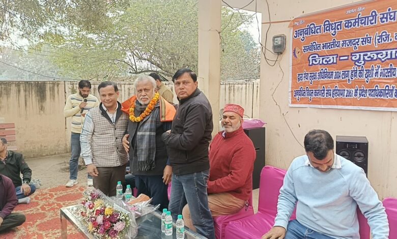 अनुबंधित विद्युत कर्मचारी संघ गुरुग्राम की टीम ने सेवा सुरक्षा अधिनियम सर्विस एक्ट 2024 पोर्टल लॉन्च होने की खुशी में किया भारतीय मजदूर संघ का मान सम्मान