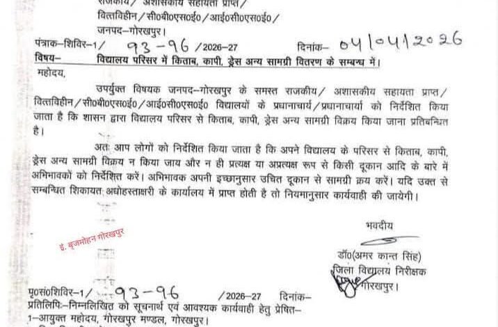 गोरखपुर। नए शैक्षिक सत्र (2026-27) की शुरुआत के साथ ही गोरखपुर जिले के अभिभावकों के लिए एक बड़ी और राहत भरी खबर है। स्कूलों की मनमानी और कमीशनखोरी पर लगाम कसते हुए जिला विद्यालय निरीक्षक (डीआईओएस) डॉ. अमर कान्त सिंह ने एक सख्त आदेश जारी किया है। अब जिले के किसी भी स्कूल परिसर के अंदर किताबें, कॉपी, ड्रेस या अन्य पठन-पाठन सामग्री नहीं बेची जा सकेगी।