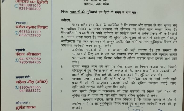 गोरखपुर जर्नलिस्ट्स प्रेस क्लब ने मुख्यमंत्री को सौंपा मांग पत्र, समस्याओं के समाधान का मिला आश्वासन
