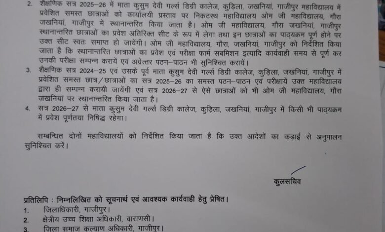 कार्यपरिषद के निर्णय के अनुसार सत्र 2025-26 में माता कुसुम देवी गर्ल्स डिग्री कॉलेज में प्रवेशित सभी छात्राओं को निकटस्थ ओम जी महाविद्यालय, गौरा जखनियां में स्थानांतरित किया जाएगा। इन छात्राओं का प्रवेश ओम जी महाविद्यालय में अतिरिक्त सीटों के रूप में किया जाएगा। विश्वविद्यालय ने निर्देश दिया है कि स्थानांतरित छात्राओं के प्रवेश, परीक्षा फॉर्म भरने एवं शैक्षणिक कार्य समयबद्ध रूप से पूरे कराए जाएं।
