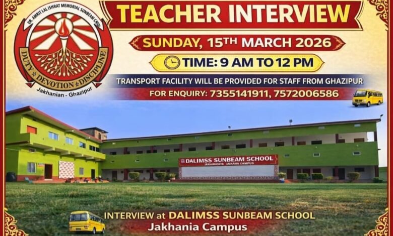 जखनिया गाजीपुर। जिले के प्रतिष्ठित शिक्षण संस्थान डालिम्स सनबीम स्कूल, जखनिया गाजीपुर द्वारा विभिन्न पदों पर योग्य एवं प्रतिभाशाली शिक्षकों की भर्ती के लिए साक्षात्कार आयोजित किया जा रहा है। यह भर्ती प्रक्रिया 15 मार्च 2026 को आयोजित की जाएगी। विद्यालय प्रबंधन द्वारा दी गई जानकारी के अनुसार, इस भर्ती में मदर टीचर, PRT (सभी विषय), TGT (English, SST), PGT (English, Business Studies, Banking, Physics),के लिए आवेदन आमंत्रित किए गए हैं। चयनित अभ्यर्थियों को CBSE मानकों के अनुसार वेतन प्रदान किया जाएगा। साक्षात्कार का आयोजन प्रातः 09:00 बजे से डालिम्स सनबीम स्कूल जखनिया गाजीपुर में किया जाएगा। विद्यालय प्रबंधन ने बताया कि सभी अभ्यर्थियों के लिए अच्छी कम्युनिकेशन स्किल अनिवार्य है। इसके अलावा विद्यालय की ओर से गाजीपुर शहर से दैनिक परिवहन सुविधा तथा इनहाउस आवास की सुविधा भी उपलब्ध कराई जाएगी। इच्छुक एवं योग्य अभ्यर्थी निर्धारित तिथि पर अपने आवश्यक दस्तावेजों के साथ साक्षात्कार में शामिल हो सकते हैं। अधिक जानकारी के लिए अभ्यर्थी 7355141911, 7572006586 पर संपर्क कर सकते हैं। विद्यालय प्रबंधन ने योग्य एवं उत्साही शिक्षकों से इस अवसर का लाभ उठाने और शिक्षा के क्षेत्र में अपना योगदान देने की अपील की है।