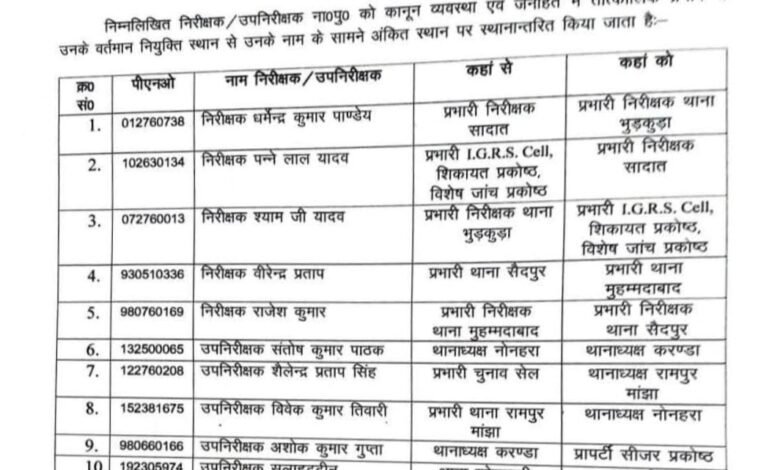 जनहित में पुलिस विभाग में बड़ा फेरबदल, कई निरीक्षक व उपनिरीक्षकों के तबादले