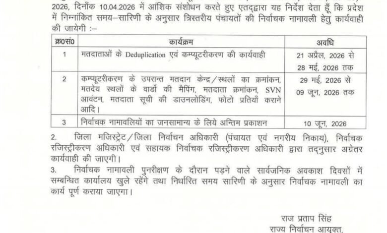 लखनऊ: उत्तर प्रदेश में त्रिस्तरीय पंचायत चुनावों को लेकर हलचल तेज हो गई है। राज्य निर्वाचन आयुक्त राज प्रताप सिंह ने मतदाता सूची (Voter List) के पुनरीक्षण के लिए संशोधित समय-सारणी जारी कर दी है। नए आदेश के मुताबिक, अब प्रदेश में 10 जून 2026 को अंतिम मतदाता सूची का प्रकाशन किया जाएगा।