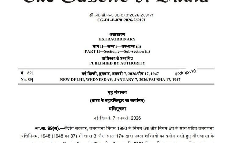 भारत की जनगणना 2027 के प्रथम चरण – मकानसूचीकरण और मकानों की गणना (HLO) हेतु अधिसूचना जारी।
