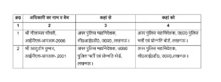 यूपी सरकार ने दो वरिष्ठ आईपीएस अधिकारियों के कार्यक्षेत्र में बदलाव किया है। आईपीएस आरआर-2000 बैच के अधिकारी नीलाब्जा चौधरी को अपर पुलिस महानिदेशक, सीआईडी, लखनऊ से हटाकर अपर पुलिस महानिदेशक, यूपी पुलिस भर्ती एवं प्रोन्नति बोर्ड, लखनऊ बनाया गया है। वहीं आईपीएस आरआर-2001 बैच के आशुतोष कुमार को अपर पुलिस महानिदेशक, यूपी पुलिस भर्ती एवं प्रोन्नति बोर्ड से स्थानांतरित कर अपर पुलिस महानिदेशक, सीआईडी, लखनऊ की जिम्मेदारी सौंपी गई है।