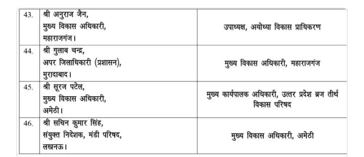 यूपी में 46 अफसरों का तबादला किया गया है। इसमें IAS कृतिका ज्योत्सना को बस्ती का डीएम, वाराणसी के सीडीओ हिमांशु नागपाल को वाराणसी का नगर आयुक्त बनाया गया है। वाराणसी की एडीएम वंदिता श्रीवास्तव को कुशीनगर का सीडीओ बनाया गया है। रामपुर के सीडीओ नंद किशोर कलाल को गाजियाबाद का उपाध्यक्ष बनाया गया है। मिर्जापुर के आईएएस बाल कृष्ण त्रिपाठी को सचिवालय सामान्य प्रशासन बनाया गया है।