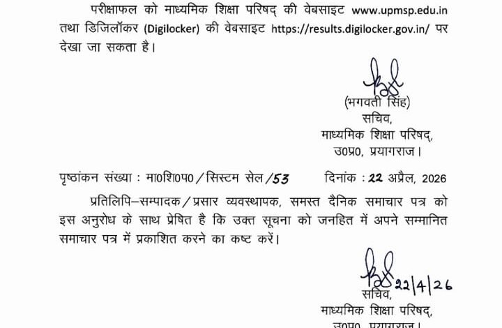 माध्यमिक शिक्षा परिषद, प्रयागराज मुख्यालय से प्राप्त आधिकारिक जानकारी के अनुसार, कल यानी 23 अप्रैल 2026 को शाम 04:00 बजे परीक्षाफल जारी किए जाएंगे।
