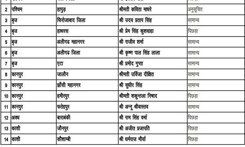 मेरठ जिला-हरवीर पालहापुड़-कविता माधरेफिरोजाबाद जिला-उदय प्रताप सिंहहाथरस-प्रेम सिंह कुशवाहाअलीगढ़ महानगर-राजीव शर्माअलीगढ़  जिला-कृष्ण पाल सिंह लालाएटा-प्रमोद गुप्ताजालौन-उर्विजा दीक्षितझांसी महानगर-सुधीर सिंहहमीरपुर-शकुन्तला निषादफतेहपुर-अन्नू श्रीवास्तवबाराबंकी-राम सिंह वर्माजौनपुर-अजीत प्रजापतिकौशांबी-धर्मराज मौर्या