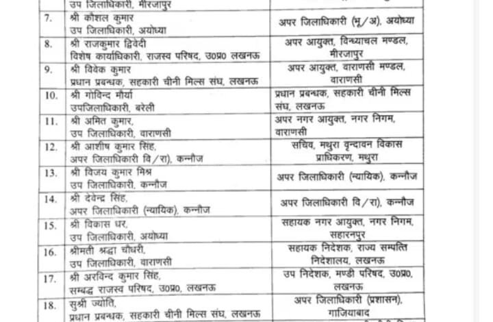 यूपी में बड़े पैमाने पर पीसीएस अधिकारियों के तबादले किए गए हैं। 27 नौकरशाह इधर से उधर भेजे गए हैं। बाराबंकी के अपर जिलाधिकारी अरूण सिंह को मुरादाबाद का अपर आयुक्त बनाया गया है। अयोध्या के उपजिलाधिकारी कौशल कुमार को अयोध्या का अपर जिलाधिकारी बनाया गया है। ज्योति को अपर जिलाधिकारी गाजियाबाद बनाया गया है।