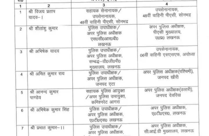 सोनभद्र स्थित 48वीं वाहिनी पीएसी में तैनात विजय प्रताप यादव-प्रथम को वहीं उपसेनानायक बना दिया गया है। एससीआरबी में तैनात शीतांशु कुमार को पीएसी मुख्यालय, डीजीपी मुख्यालय से संबद्ध अभिषेक यादव को अयोध्या में 8वीं वाहिनी एसएसएफ, एटा में तैनात अमित कुमार राय को खीरी में एएसपी पश्चिमी, आगरा कमिश्नरेट में तैनात आनंद कुमार पांडेय को देवरिया में एएसपी उत्तरी बनाकर भेजा गया है। एटीएस में तैनात अभिषेक सिंह को एएसपी बना दिया गया है। कानपुर स्थित केंद्रीय वस्त्र भंडार में तैनात प्रभात कुमार द्वितीय को सीआईडी मुख्यालय भेजा गया है।श्यामकांत को बलिया की जगह बस्ती और बृजनंदन राय को बलरामपुर की जगह प्रतापगढ़ में एएसपी बनाकर भेजा गया है। एसटीएफ में तैनात संजीव कुमार दीक्षित को एएसपी बना दिया गया है। फतेहपुर में तैनात कृष्ण गोपाल सिंह को बिजनौर में एएसपी सिटी बनाया गया है। सीतापुर में तैनात दिनेश कुमार शुक्ला को बलिया में एएसपी उत्तरी बनाया गया है। कासगंज में तैनात संतोष कुमार तृतीय को नोएडा में अपर पुलिस उपायुक्त बनाया गया है।पीटीसी सीतापुर में तैनात राजकुमार पांडेय को गोरखपुर में एएसपी ट्रैफिक बनाया गया है। रेलवे झांसी में तैनात सोहराब आलम को केंद्रीय वस्त्र भंडार भेजा गया है। एलआईयू मेरठ में तैनात प्रीति सिंह को झांसी में एएसपी सिटी बनाया गया है। नोएडा कमिश्नरेट में तैनात बाबा साहब वीर कुमार को वाराणसी कमिश्नरेट में अपर पुलिस उपायुक्त बनाया गया है।