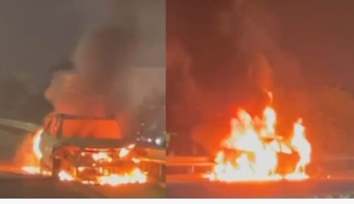 लखनऊ चलती कार में तेज धमाका, कुछ ही सेकंड में आग का गोला बनी ईवी, तीन लाख कैश और दस्तावेज खाक