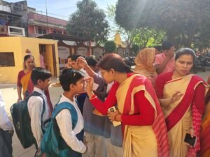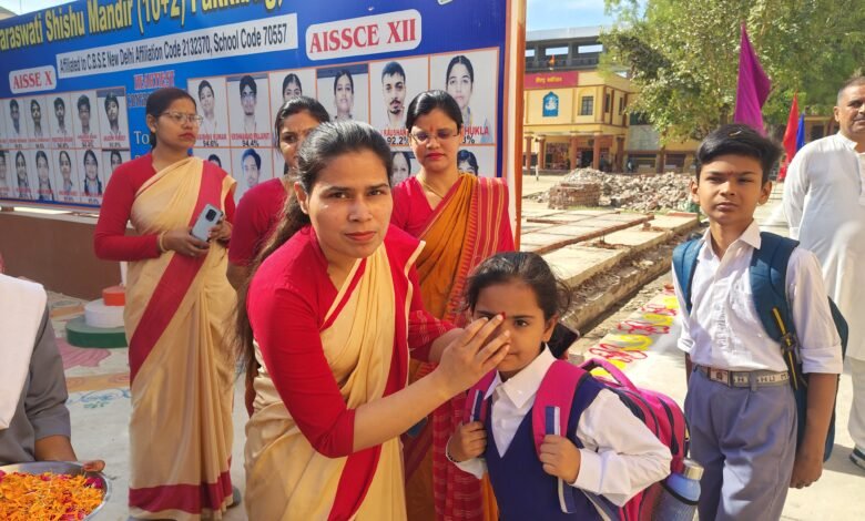 भव्य स्वागत: विद्यालय के मुख्य द्वार पर प्रवेश करते ही नवागत एवं पुराने विद्यार्थियों का तिलक लगाकर और पुष्प वर्षा कर आत्मीय स्वागत किया गया। इस भावपूर्ण स्वागत से छात्र-छात्राएं प्रफुल्लित नजर आए।