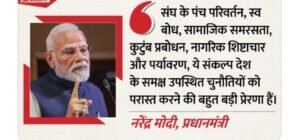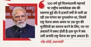 संघ के पंच परिवर्तन, स्व बोध, सामाजिक समरसता, कुटुंब प्रबोधन, नागरिक शिष्टाचार और पर्यावरण, ये संकल्प देश के समक्ष उपस्थित चुनौतियों को परास्त करने की बहुत बड़ी प्रेरणा हैं। स्व बोध की भावना का उद्देश्य गुलामी की मानसिकता से मुक्त होकर अपनी विरासत पर गर्व और स्वदेशी के मूल संकल्प को आगे बढ़ाना है। सामाजिक समरसता के जरिए वंचित को वरीयता देकर सामाजिक न्याय की स्थापना का प्रण है। आज इसको घुसपैठियों के कारण बड़ी चुनौती मिल रही है। देश ने भी इससे निपटने के लिए डेमोग्राफी मिशन की घोषणा की है। हमें कुटुंब प्रबोधन यानी परिवार संस्कृति व मूल्यों को भी मजबूत बनाना है। नागरिक शिष्टाचार के जरिए नागरिक कर्तव्य का बोध हर देशवासी में भरना है। पर्यावरण की रक्षा करते हुए भावी पीढ़ियों के भविष्य को सुरक्षित करना है।अपने इन संकल्पों को लेकर संघ अब अगली शताब्दी की यात्रा शुरू कर रहा है। 2047 के विकसित भारत में संघ का हर योगदान, देश की ऊर्जा बढ़ाएगा, देश को प्रेरित करेगा। पुन: प्रत्येक स्वयंसेवक को बहुत-बहुत शुभकामनाएं।