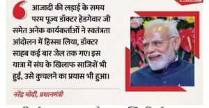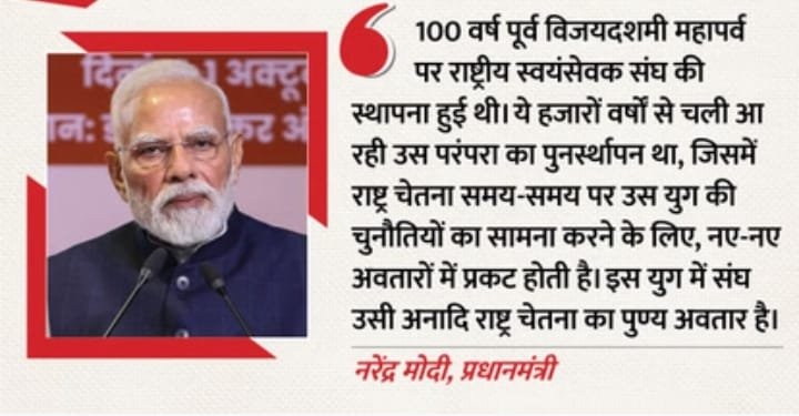 100 वर्ष पूर्व विजयदशमी महापर्व पर राष्ट्रीय स्वयंसेवक संघ की स्थापना हुई थी। ये हजारों वर्षों से चली आ रही उस परंपरा का पुनर्स्थापन था, जिसमें राष्ट्र चेतना समय-समय पर उस युग की चुनौतियों का सामना करने के लिए, नए-नए अवतारों में प्रकट होती है। इस युग में संघ उसी अनादि राष्ट्र चेतना का पुण्य अवतार है। ये हमारी पीढ़ी के स्वयंसेवकों का सौभाग्य है कि हमें संघ के शताब्दी वर्ष जैसा महान अवसर देखने को मिल रहा है। मैं इस अवसर पर राष्ट्रसेवा के संकल्प को समर्पित कोटि-कोटि स्वयंसेवकों को शुभकामनाएं देता हूं। मैं संघ के संस्थापक, हम सभी के आदर्श परम पूज्य डॉक्टर हेडगेवार जी के चरणों में श्रद्धांजलि अर्पित करता हूं। 100 वर्षों की इस गौरवमयी यात्रा की स्मृति में सरकार ने विशेष डाक टिकट और स्मृति सिक्के भी जारी किए हैं।
