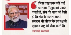 जब संघ अस्तित्व में आया था तो उस समय की आवश्यकताएं, उस समय के संघर्ष कुछ और थे। लेकिन आज 100 वर्षों बाद जब भारत विकसित होने की तरफ बढ़ रहा है तब आज के समय की चुनौतियां, संघर्ष अलग हैं। दूसरे देशों पर आर्थिक निर्भरता, हमारी एकता को तोड़ने की साजिशें, डेमोग्राफी में बदलाव के षड्यंत्र, हमारी सरकार इन चुनौतियों से तेजी से निपट रही है। मुझे ये खुशी है कि राष्ट्रीय स्वयंसेवक संघ ने भी इन चुनौतियों से निपटने के लिए ठोस रोडमैप बनाया है।