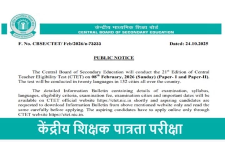 CBSE CTET Exam: केन्द्रीय माध्यमिक शिक्षा बोर्ड (CBSE) ने बहुप्रतीक्षित सीटेट परीक्षा के संबंध में महत्वपूर्ण नोटिस जारी किया है। जारी नोटिस के अनुसार, केंद्रीय शिक्षक पात्रता परीक्षा (CTET) का 21वां संस्करण 8 फरवरी 2026 (रविवार) को आयोजित किया जाएगा। यह परीक्षा देश के 132 शहरों में 20 भाषाओं में आयोजित होगी। परीक्षा में पेपर-1 और पेपर-2 दोनों शामिल होंगे।